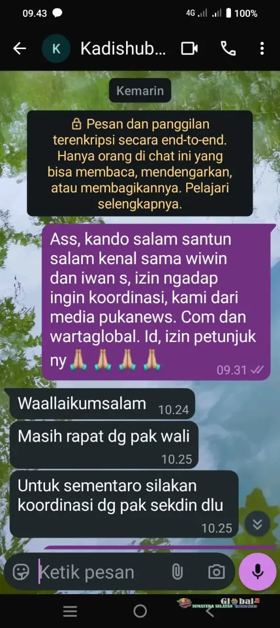 Untuk mendapatkan kejelasan dan tidak ada kesalahpahaman, awak media langsung klarifikasi kepada Kepala Dishub Kota Prabumulih, Bapak S. Feri, SE, M.Si melalui pesan WhatsApp. Namun, balasan yang diterima hanya satu kalimat saja: "Saya sedang rapat bersama Pak Wali Kota, silakan koordinasi langsung ke kantor dengan sekretaris."