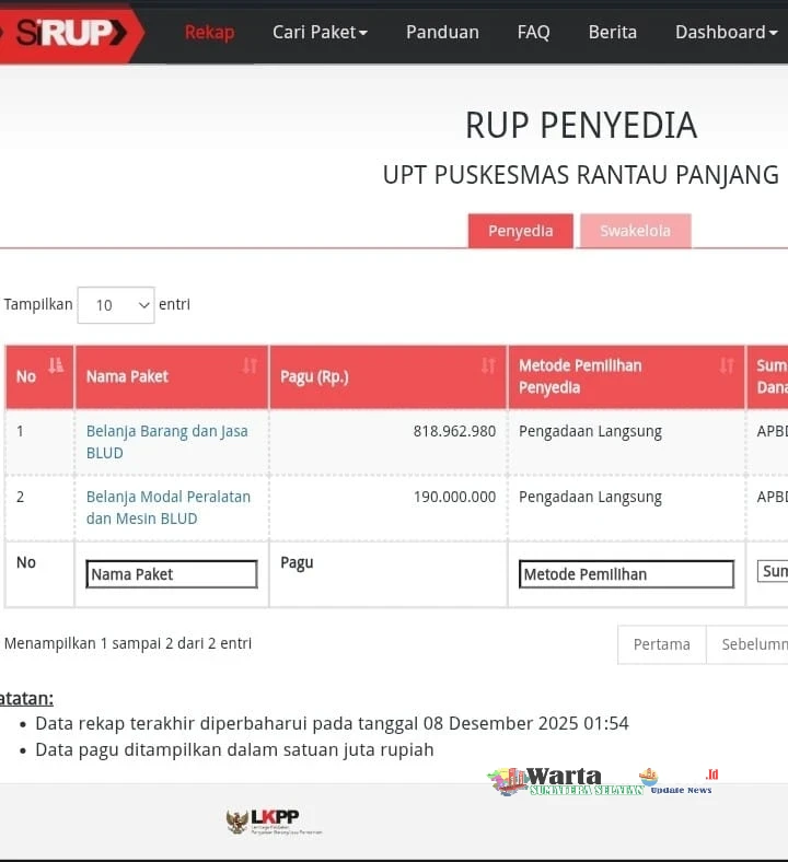 Warta Global.id – Isu transparansi dan kemungkinan korupsi mengelilingi pengelolaan dana belanja barang dan jasa BLUD Puskemas Rantau Panjang menyala hangat. Data dan informasi dari beberapa sumber yang diperoleh tim penulis mengungkapkan, dana RUP LKP (Rencana Usaha dan Pembiayaan Layanan Kesehatan) puskesmas tersebut mencapai angka yang cukup pantastis: Rp 818.972.980 – namun tujuannya tidak jelas sama sekali, bahkan tidak ada dokumen rincian yang dapat dipertanggungjawabkan terkait penggunaannya.