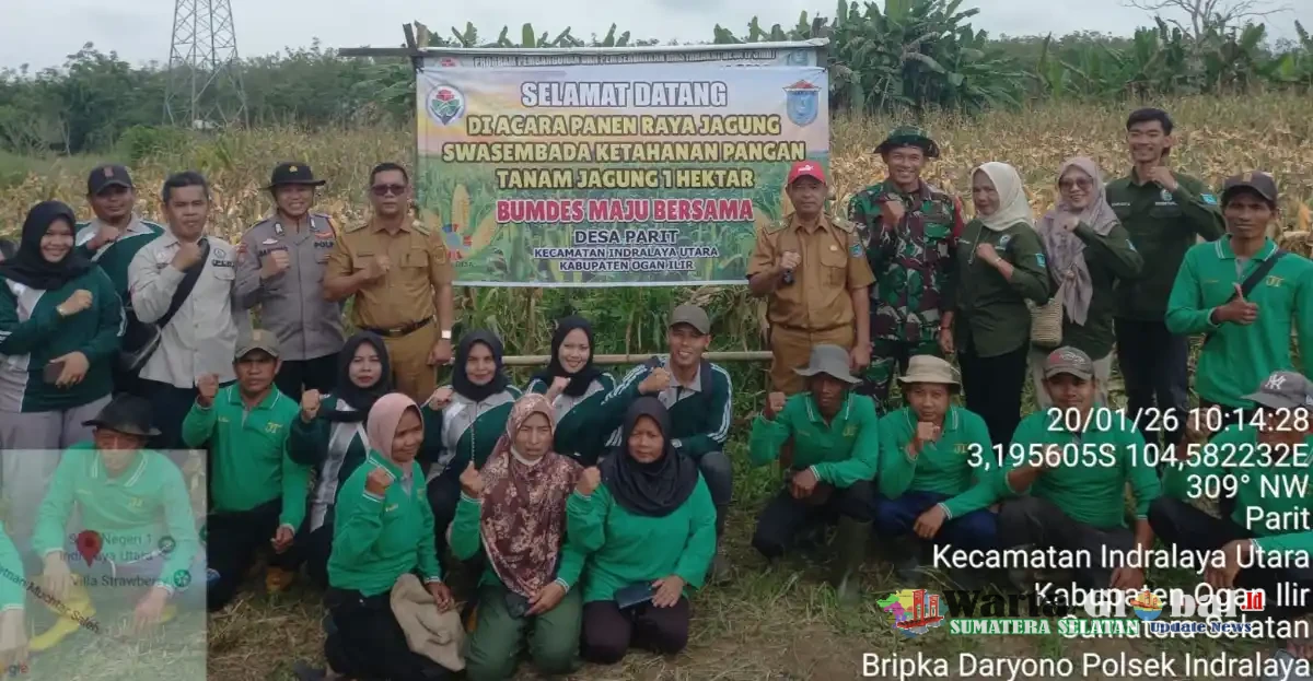 Polsek Indralaya Polres Ogan Ilir bersama Pemerintah Daerah melaksanakan kegiatan Panen Jagung Program Ketahanan Pangan di Dusun III Desa Parit, Kecamatan Indralaya Utara, Kabupaten Ogan Ilir, Selasa (20/1/2026) sekitar pukul 09.30 WIB.