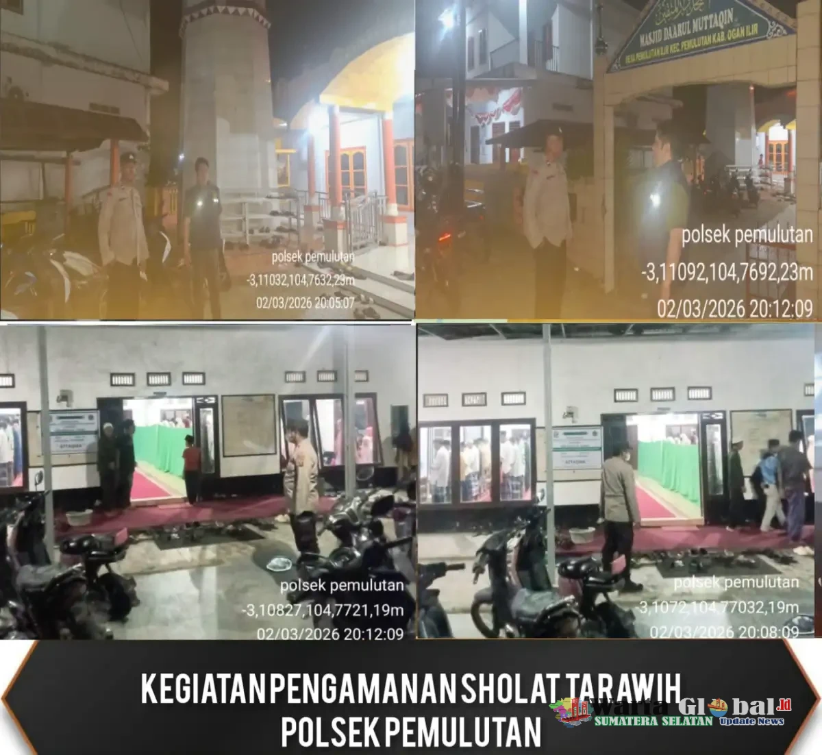 Pemulutan – wartaglobal.id Dalam rangka menjaga keamanan dan kenyamanan masyarakat selama bulan suci Ramadhan 1447 H, Polres Ogan Ilir melalui Polsek Pemulutan melaksanakan kegiatan pengamanan Sholat Tarawih sekaligus mengantisipasi tindak pidana pencurian kendaraan bermotor (Curanmor) di wilayah hukumnya, Senin (2/3/2026) malam.